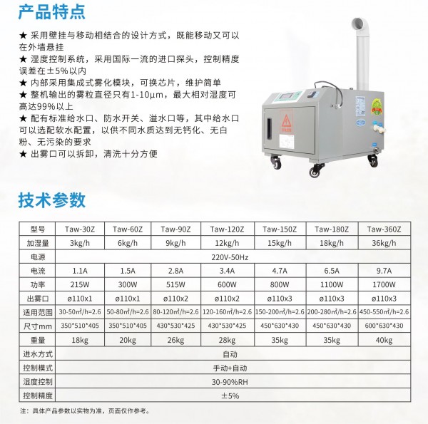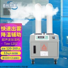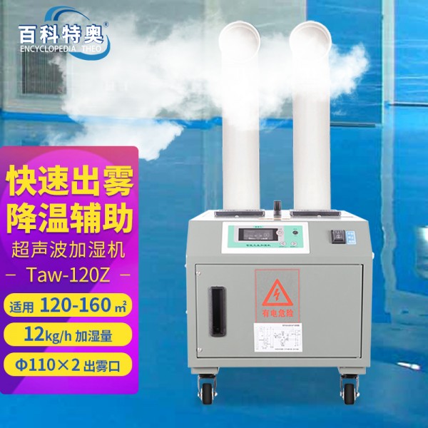 百科特奥12KG加湿机Taw-120Z、12公斤超声波加湿机 Taw-120Z。超声波式是目前市场占有率最高的一种加湿器类型,工作原理是利用超声波的高频振动,将水打碎成水滴颗粒状,从而产生水雾,最后经由风机排出。缺点是雾化时水中的杂质和钙镁离子也被打碎喷出,从而进入人体呼吸道,而且水雾也容易夹带空气中的粉尘,对鼻炎患者、