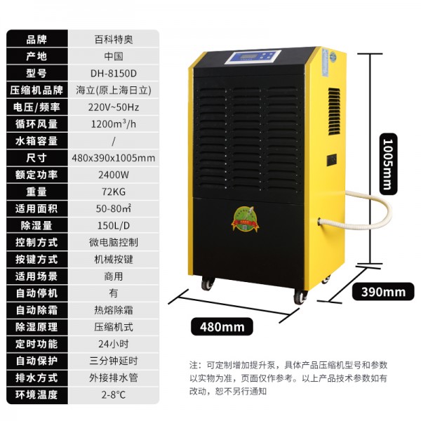 百科特奥冷库除湿机,2-8度150升除湿机DH-8150D。百科特奥低温型除湿机的适用场所和环境:低温除湿机应用于低温冷藏的相关场所,使用环境温度为2-10摄氏度,湿度为50%-70%,设备在低温情况下根据翅片温度将冷凝器和蒸发器互换,保证压缩机在低温情况下不停机。
