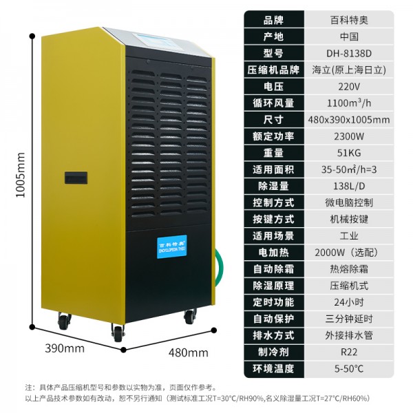 百科特奥高温除湿机,138升高温除湿机DH-8138D。安装除湿机:将除湿机放置在空气流通的地方,避免放在死角,造成气流短路,达不到需要的除湿效果。除湿机应放置在坚固平坦的地面上,以免产生振动及噪音,同时避免日光直射或接近发热器具。