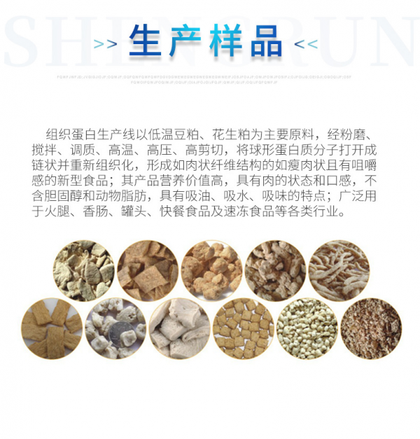 素肉食品设备大豆组织蛋白生产设备植物组织蛋白是我司根据国内外市场的需求,根据多年的挤压膨化技术,向市场推出的一种生产高蛋白、高纤维组织蛋白的生产设备。