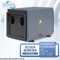 百科特奥10公斤管道除湿机,240升管道除湿机DH-8240D。强效换热省电可靠: 冷凝器采用了高效换热能力的壳管式或套管式结构,散热效果好,均能有效的避免管路堵塞现象,维护简单方便,使用寿命更长;蒸发器采用机械涨管板翅片式结构,匹配内螺纹结构的紫铜管和均流分流头,不仅增大了换热面积,还保证了蒸发换热效率。在大风量的风机作用下,机组换热将更加充分、高效。