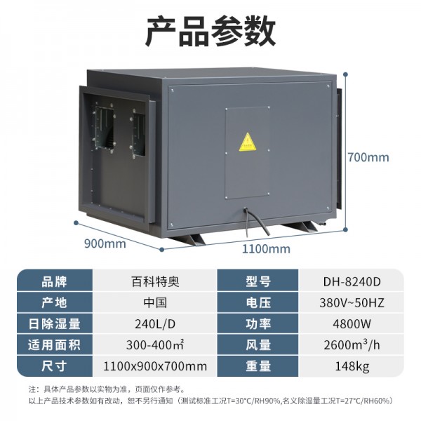 百科特奥10公斤管道除湿机,240升管道除湿机DH-8240D。是用蒸发器来给空气降温除湿,并回收系统的冷凝热,弥补空气中因为冷却除湿时散失的热量,是一种高效节能的除湿方式。已经广泛应用于工业、医药、食品、电子、特种玻璃制造、粮食、木材等对除湿与温度控制要求较高的场所。