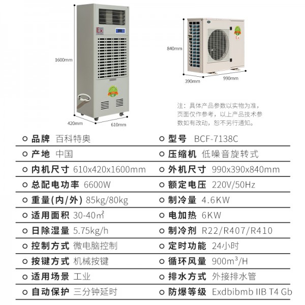 百科特奥138升调温除湿机,防爆调温除湿机BCF-7138C。风冷型防爆调温除湿机,具有安装简便,调试简单快速,实际运行节能环保的优势。是的调温除湿设备,比除湿机加配电加热箱这种方式性价比高。