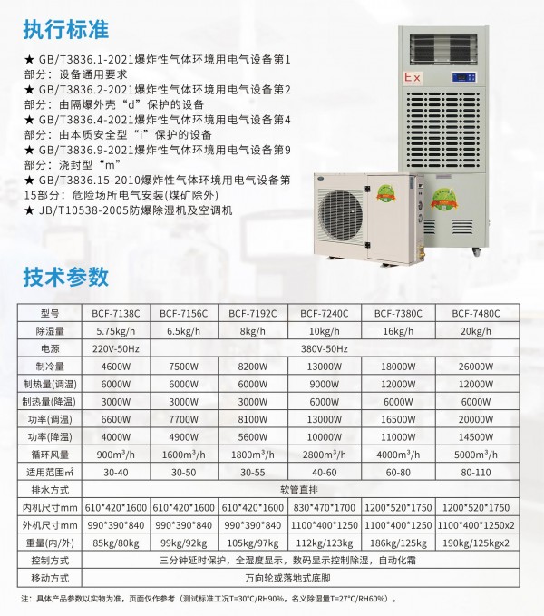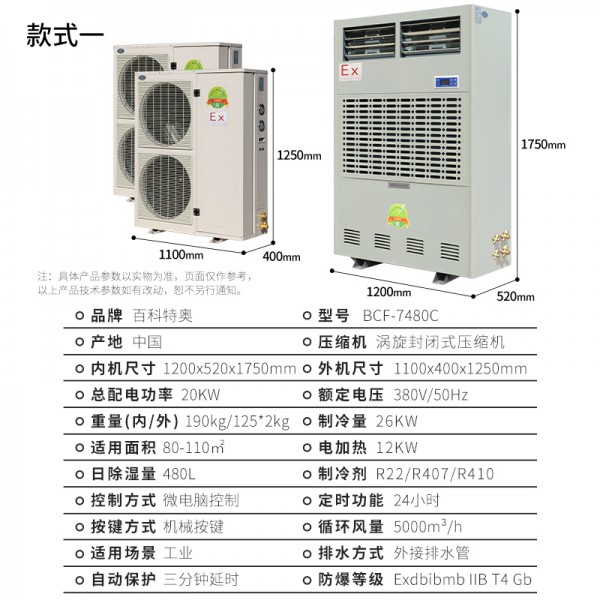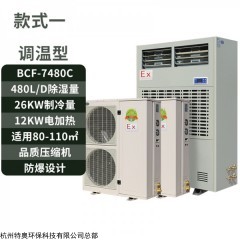 百科特奥480升除湿机,480升防爆调温除湿机BCF-7480C。防爆型调温除湿机可广泛应用于1区,2区防爆级别,涵盖国防、科研、石油、化工、医药、加工制造、生物制药等多种行业,为存在ⅡA、ⅡB级,T1~T4组可燃性气体、蒸汽与空气混合形成的易引发爆炸的危险场所,并有温度控制、除湿要求场所设计的特种调温除湿控制设备,调温型防爆除湿机其外形美观,设计合理并具有安装维修方便等特点,全系列防爆产品内部采用压缩机、微电脑控制、数字显示,具有噪声低、性能稳定、操作简便等优点。深受广大特需行业客户喜爱。
