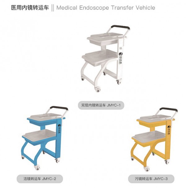 医用内镜转运车分为双层内镜转运车JMYC-1、洁镜转运车JMYC-2、污镜转运车JMYC-3,专车专用有效避免交叉感染。