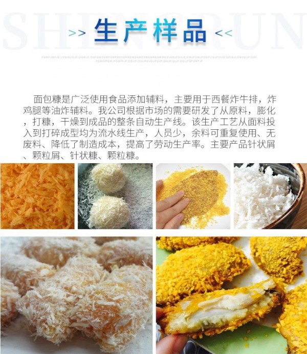 我公司研制开发的面包糠专用生产线改变了传统面包糠生产工艺,从发酵生产工艺演变为直接挤压膨化工艺,简化了生产工艺,余料可以重复利用,无废料,提高了产品品质,降低了制造成本,提高了劳动生产率
