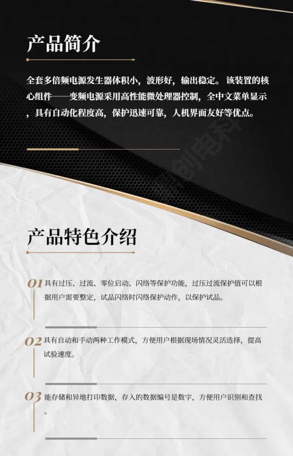 3、多倍频电源发生器具有自动和手动两种工作模式,方便用户根据现场情况灵活选择,提高试验速度。