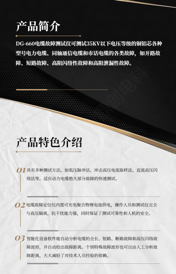 1. DG-660 电缆故障测试仪可测试35KV以下电压等级的铜铝芯各种型号电力电缆、同轴通信电缆和市话电缆的各类故障,如开路故障、短路故障、高阻闪络性故障和高阻泄漏性故障。