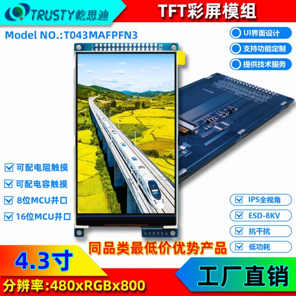 规格型号 :T043MAFPFN3 屏幕尺寸: 4.3”外形尺寸 :W63.0×H117.0 (mm) 分 辨 率: 480×RGB×800视窗尺寸: W57.5×H95.0 (mm) 视 角 :FULL显示尺寸: W56.16×H93.6 (mm) 工作电压 :3.3V工作温度: -20℃~+70℃ 背光亮度: 250Cd/m2