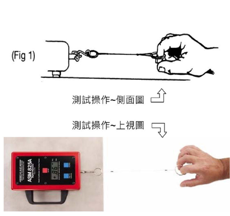 操作前做好准备工作,并且清扫干净传感器后,轻轻平放测滑仪为正式测试做准备。在仪器的末端轴上连上尼龙丝线的链子。用两个手指拉动丝线,手的其余部分与钩子垂直,线撑直。用食指勾住线的环,卷曲食指拉动测滑仪,然后读出测滑仪显示的数据。然后按一下重置按钮2次,在4个垂直方向重复以上测试方式,直到抽样测到一个的数值可以记录。一个不正常的,或高,或低的数值都要被舍弃,然后重新测出另外一个数值。美国保险商实验所(UL)和美国产品材料试验学会共同采用0.50静摩擦系数或以上,均被公认是提供表面的标准。