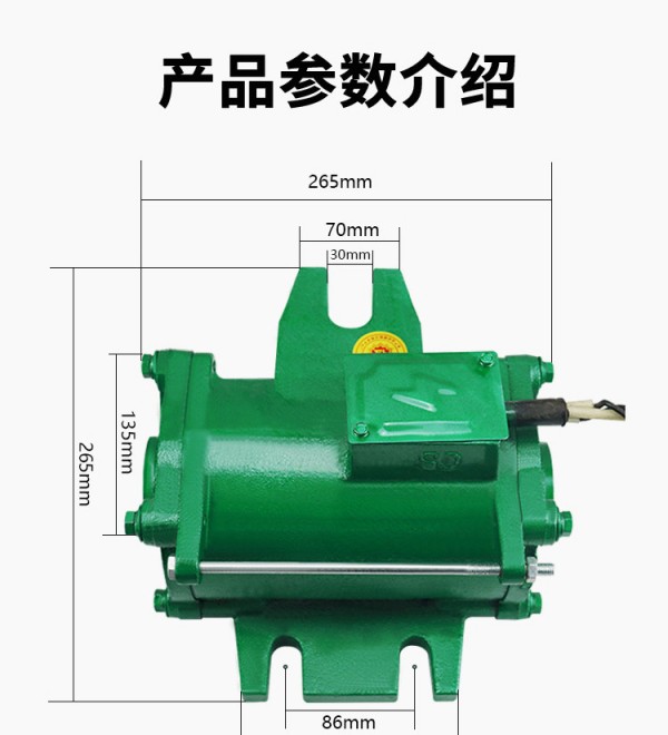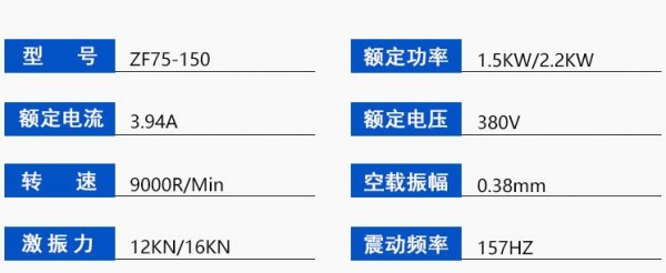 高效能:连续工作时间不超过10分钟持续通电频率8%,性能稳定,振频高达157Hz,振幅小于0.38mm,功率为1.5KW,输入电压为380V/50Hz。