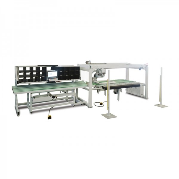 FOM INDUSTRIE装配台,用于PVC、木铝和铝窗框的五金件的完整装配,带有周边五金件,包括3轴钻孔单元和正面铣削单元。
