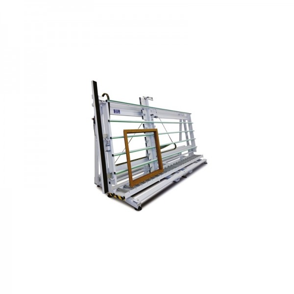FOM INDUSTRIE用于测试和玻璃框架的垂直工作台,宽度可达2400毫米。滑动梁被一个架子挡住,以检查拐角的确切90°。允许侧出窗,便于将玻璃夹条插入下侧。
