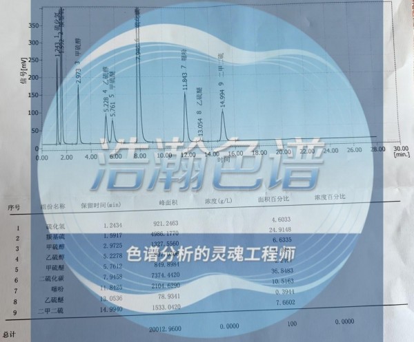 浩瀚色谱(山东)应用技术开发有限公司,使用气体采样袋,HH-S3专用柱火焰光度检测器FPD气相色谱分析空气中硫化氢、甲硫醇、甲硫醚、二甲二硫共4种恶臭硫化物。实验表明,此方法线性好,检出限为3.1×10-5 mg/m3 ~1.2×10-4mg/m3,精密度为0.8%~1.3%,空白加标回收率为84.6%~112.0%。这种方法可以准确可靠且适用于测定硫化物。