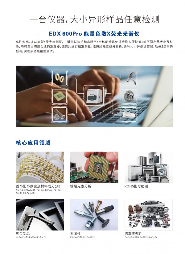 在金属电镀层厚度检测上,特别是超薄样品,EDX600PRO 有着非常卓越的稳定性与精密度,测试效 果可以与超高倍数的电子显微镜测试精度媲美。