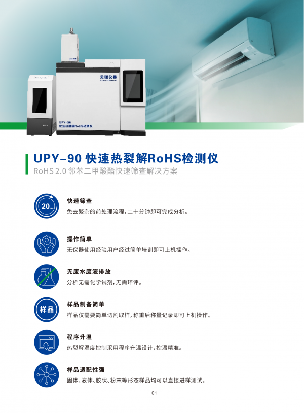 UPY-90用于有机物的检测,具有检出限低,定性能力强、定量准确的特点,可有效的应用于RoHS 2.0中增塑剂DIBP、DBP、BBP、DEHP;阻燃剂六溴环十二烷、多溴联苯和多溴联苯醚等物质的检测。