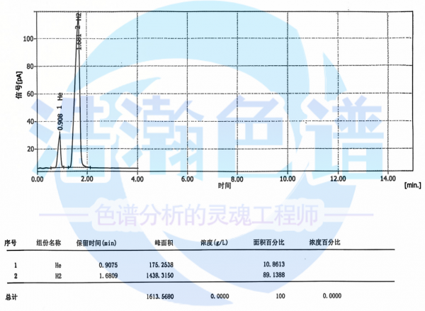 纯氖中氦/氢测定6m*4mm的填充柱测试谱图: