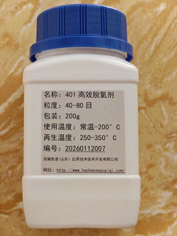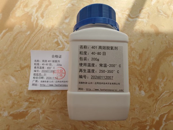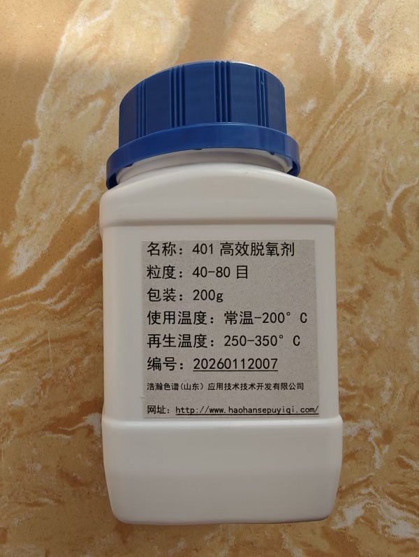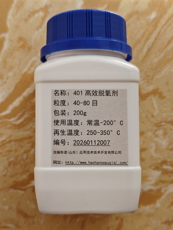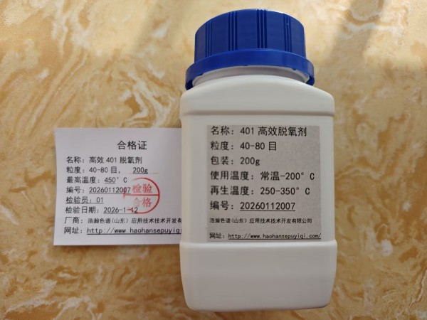 401型脱氧剂可在常温下高效直接除去氮、氢、氦等气体中的杂质氧,净化后的气体中残余氧含量约为10-5ml/l,脱氧容量一般可达15mg/g,脱氧剂失效后还可再生重复使用。该脱氧剂吸氧后从绿色变为暗褐色,具有直观的变色指示作用,在使用上极为方便。